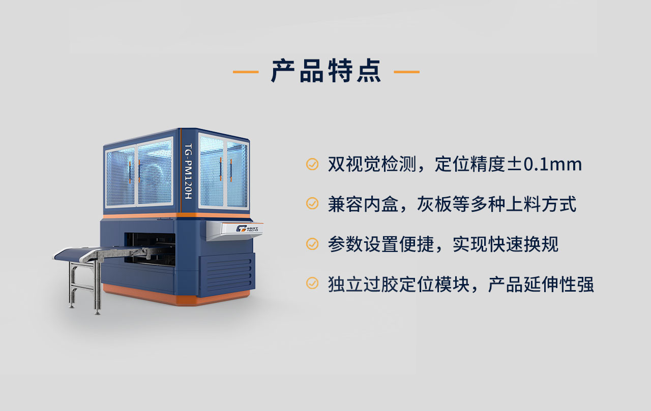 TG-PM120P型全智能三合一定位機(jī)應(yīng)用于煙包、禮品盒行業(yè)等生產(chǎn)線,適用于多種工藝的定位,可實(shí)現(xiàn)天地盒、皮殼、抽屜盒、異形盒等產(chǎn)品的精準(zhǔn)定位,適用于各種需要過(guò)膠定位的高檔精品盒,皮殼可實(shí)現(xiàn)單片、多片灰板的定位。