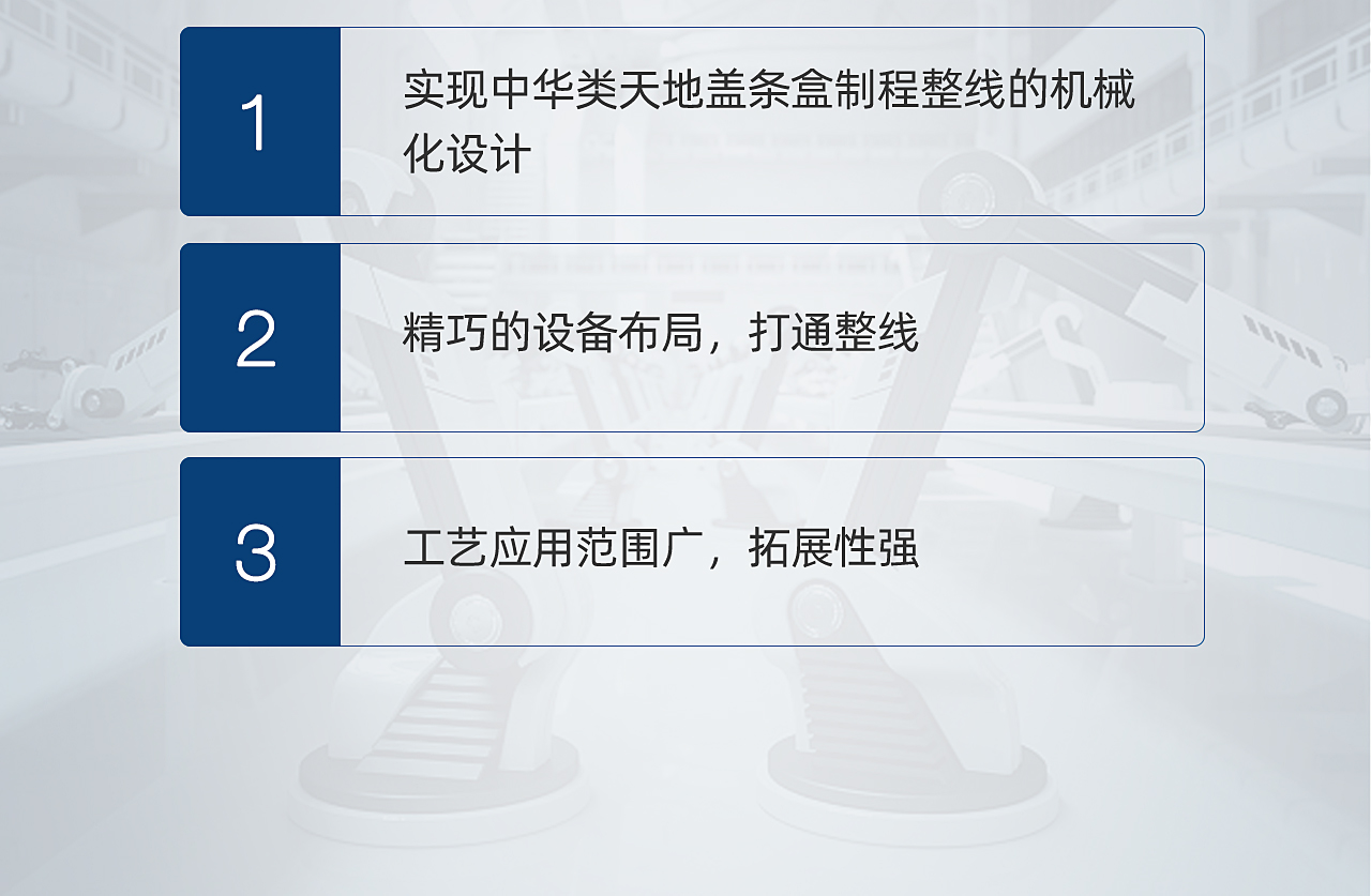 TG-CN20C型智能煙包天地蓋條盒數(shù)字化整線是我司針對(duì)高端煙包領(lǐng)域研發(fā)的天地蓋類翻蓋精品煙包整線。